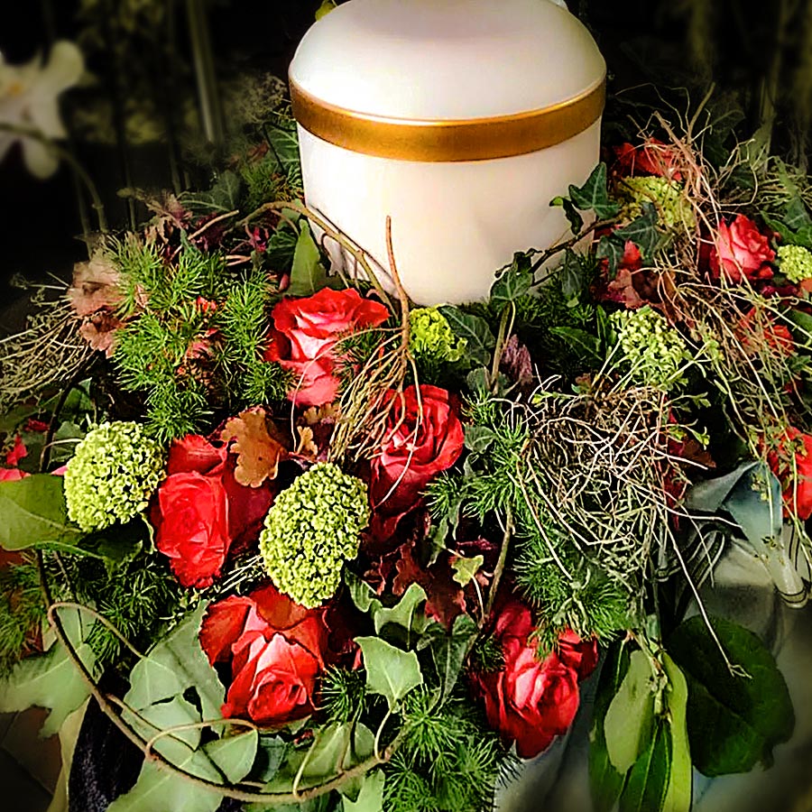Eine bedruckte Schleife oder bemalte Blätter sind beim Arrangement bereits inklusive. Begleitendes Pflanzenbeiwerk kann entsprechend Jahreszeit oder Verfügbarkeit teilweise variieren. Bei Trauergestecken und Herzen sind mit telefonischer Beratung auch kleinere Ausführungen möglich. Liefergebühr zum Friedhof: Abhängig von Entfernung und Umfang zwischen 15,00 € und 30,00 €. Bei Friedhöfen im Duisburger Westen und Süden verzichten wir auf Liefergebühren.