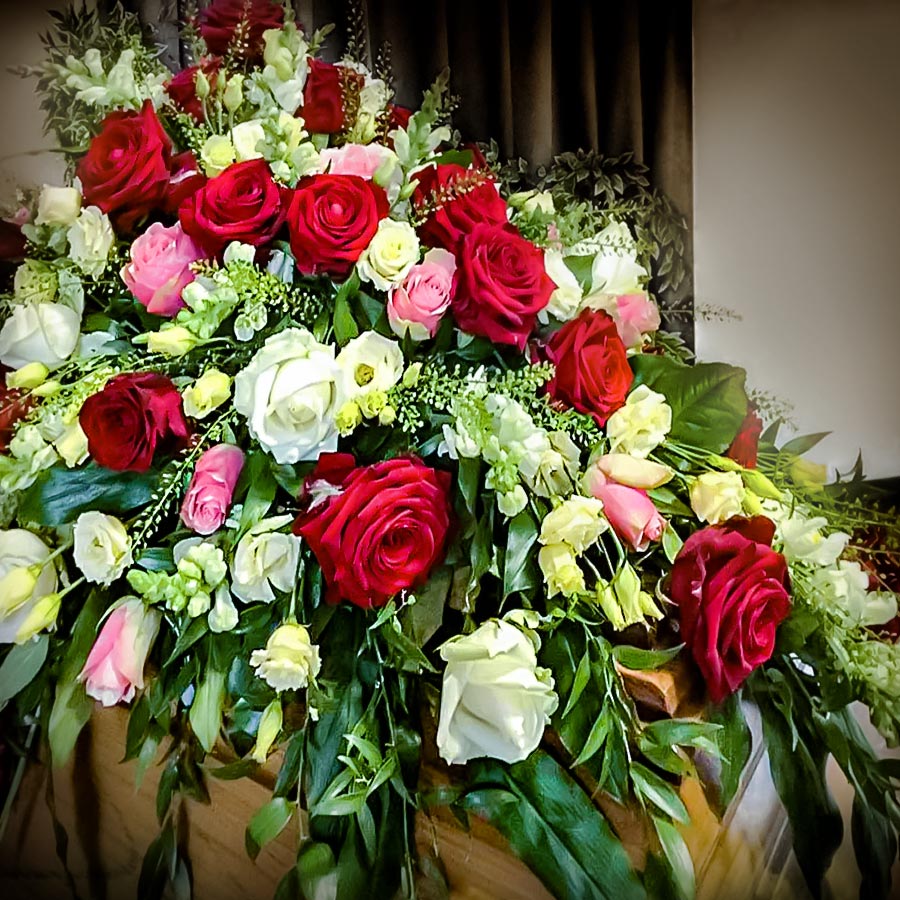 Bestehend aus Rosen in rot und rosa Tönen mit Beiwerk